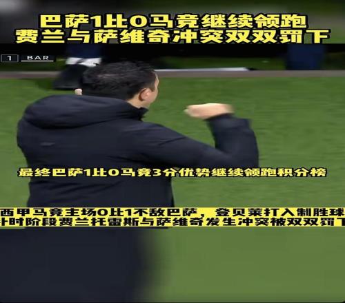 兄弟们,昨晚西甲这场巴萨打马竞的比赛,那叫一个刺激!巴萨靠着登贝莱的制胜球,1-0在马竞主场把三分揣兜里了,现在继续在积分榜上领跑。但要说最抓马的,还得是补时阶段费兰·托雷斯和萨维奇那顿互殴,俩人直接双双被罚下,这场面在西甲也算是相当炸裂了。
